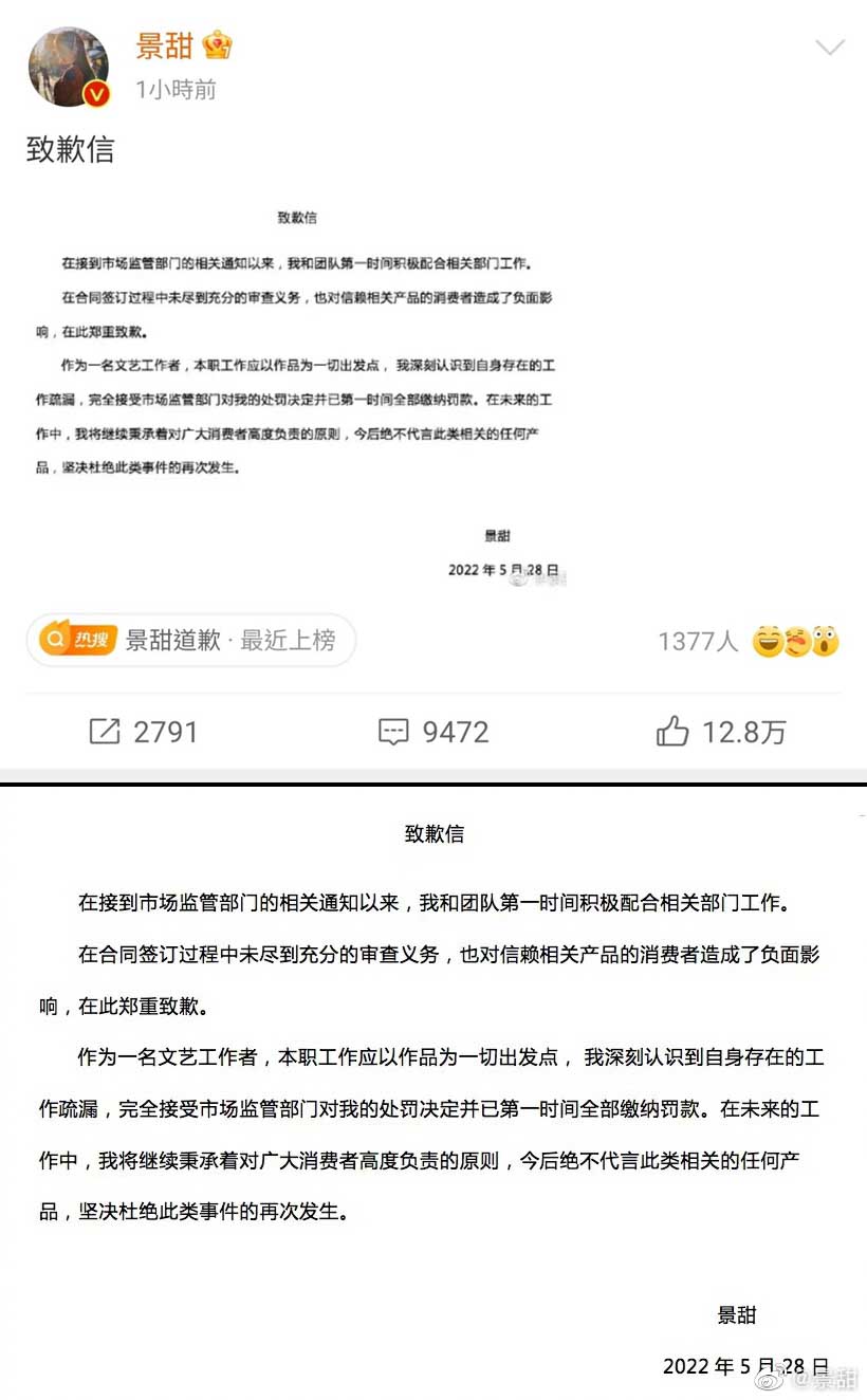 景甜中午發布的致歉信表示,一收到通知就積極配合調查,「在合同簽訂過程中未盡到充分的審查義務,也對信賴相關產品的消費者造成了負面影響,在此鄭重致歉」。