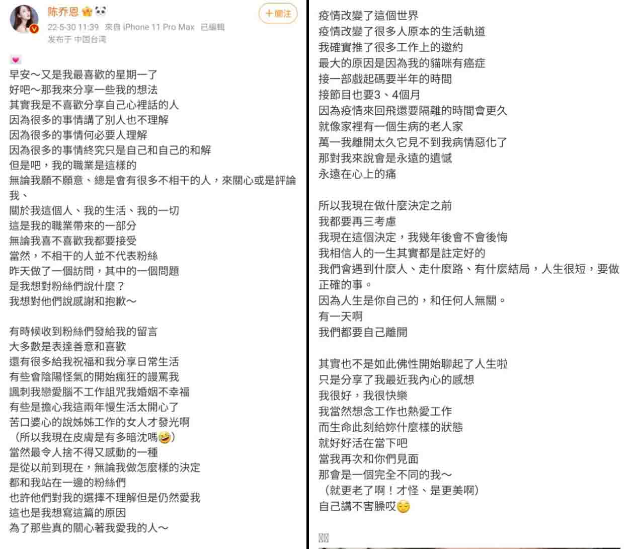▲陳喬恩公開推掉公作的原因。(圖/陳喬恩微博)