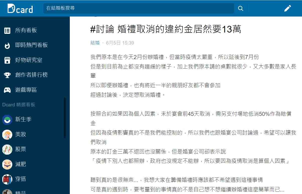 原PO在Dcard匿名板發文表示,想要直接取消婚禮、酒席的原因,除了疫情沒有趨緩之外,原訂的賓客多是長輩、桌數也不多,就算如期舉行,也有一半的人不會來參加。不過,合約載明「如果因為個人因素,未於宴會前45天取消,需另支付場地低消50%作為賠償金」。