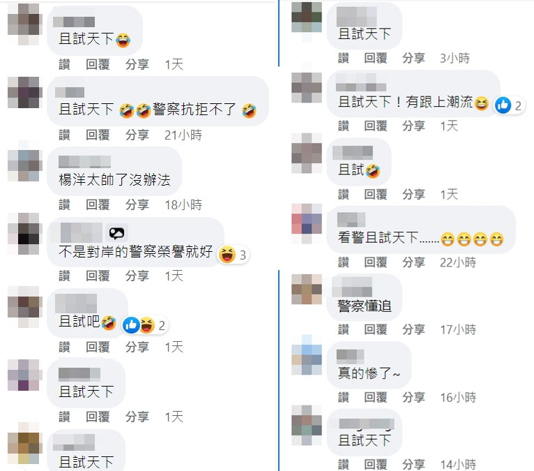 也有許多網友留言表示「且試天下,一眼就認出了」、「可能只想學學武功」、「警察抗拒不了」、「有跟上潮流」、「警察懂追」、「這黑狐狸的魅力」、「看這部,就不追究了」、「且試啦!合理」、「楊洋的魅力無所不在」、「且試天下太好看了,原諒你」。