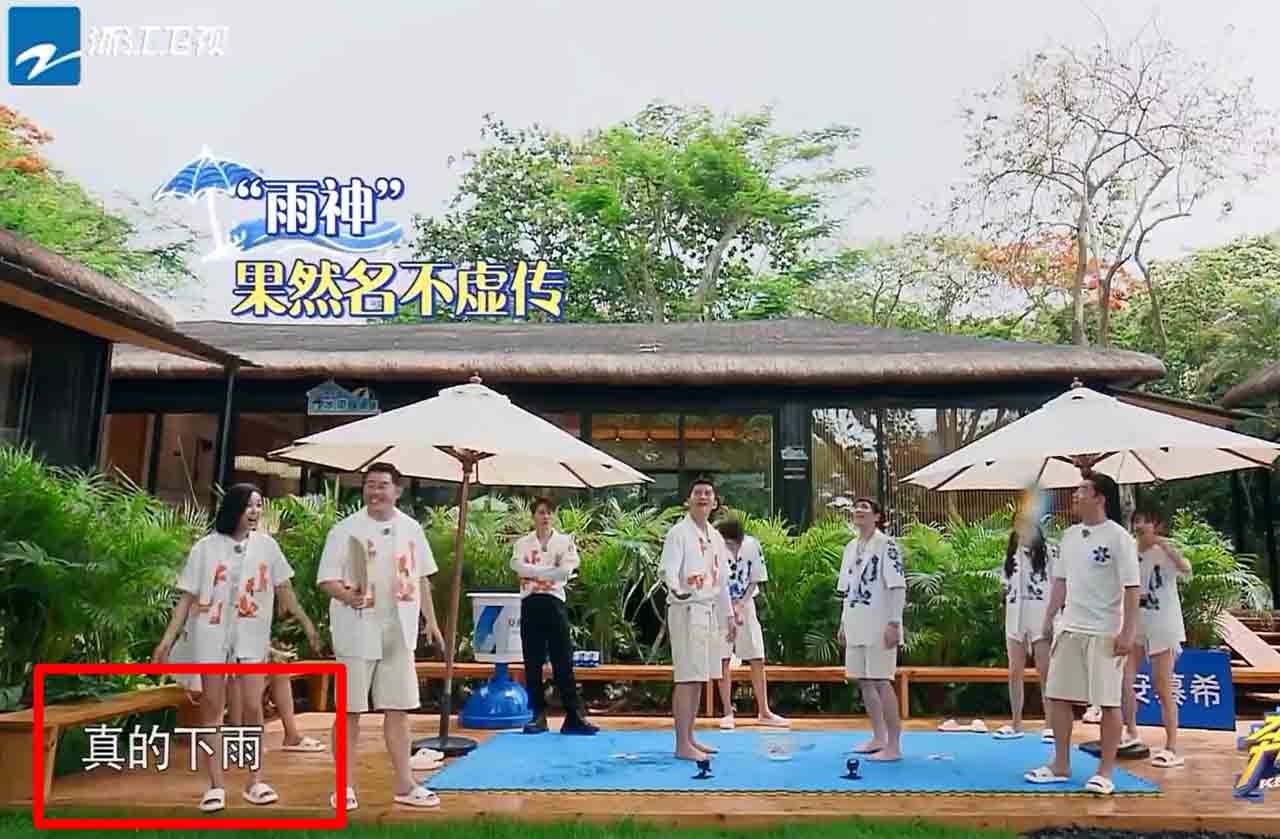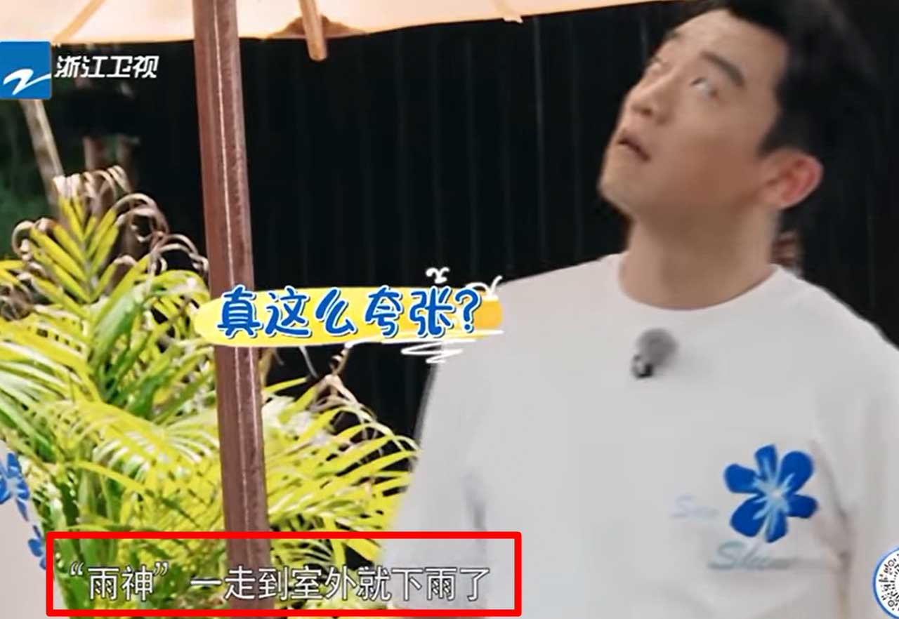 ▲原本豔陽高照的天氣突然下雨,工作人員急忙請蕭敬騰回屋內,然後雨馬上變小。(圖/浙江衛視)