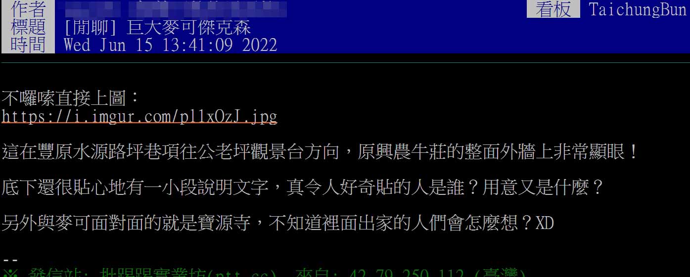 有網友昨日(15)在PTT台中板發文表示,豐原區這棟建築的外牆超級顯眼,海報下方還有一小段文字介紹麥可傑克森,「真令人好奇貼的人是誰?用意又是什麼?」