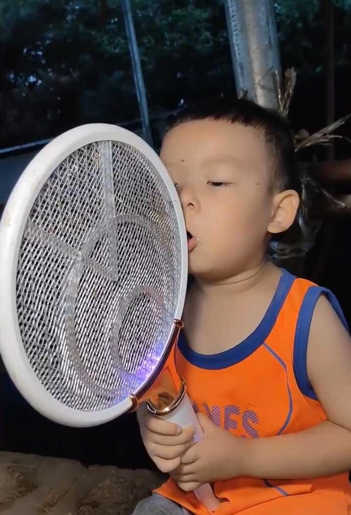 ▲男童邊開電蚊拍邊說「喔」字。(圖/微博)