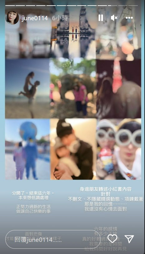 鍾蕙羽今日中午在IG發限動表示,原本只想低調處理分手一事,但身邊朋友一直把曹佑寧的小紅書轉給她看,「不刪文、不隱藏精選動態、項鍊戴著,那是我的回憶…我還沒有心情去面對」、「六年的感情,有多少不捨,真的好難過好難過…我需要的是時間,給我時間好好說再見」。