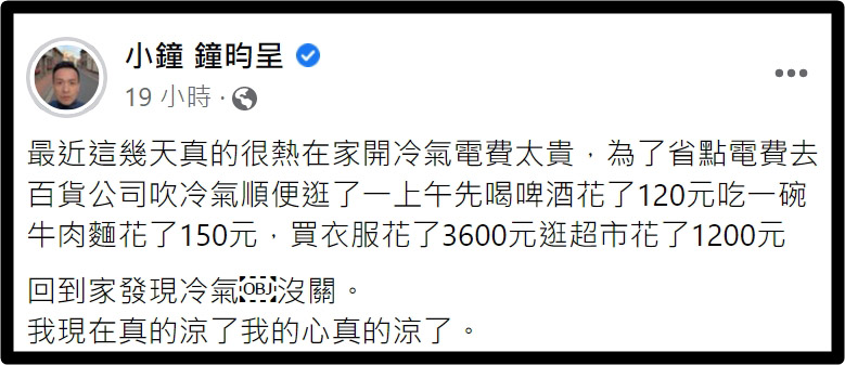 小鐘昨日(27)在臉書發文表示,最近時在是太熱了,他真的很想吹冷氣,但一直待在家裡吹冷氣,又覺得電費太貴。於是,他想到一個省電費的好方法,那就是到百貨公司吹免費的冷氣!