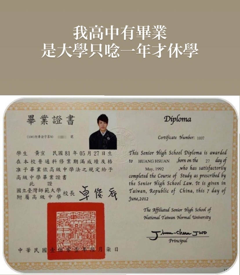 宣今日下午3時左右,在IG的限動發了自己的高中畢業證書,他強調雖然大學唸了一年就休學,但高中還是有畢業啦!照片中的他乖乖的穿著校,但髮型在當年也算得上是新潮的「九一分」加上超厚瀏海,而大眼挺鼻也能看出五官十分俊俏。