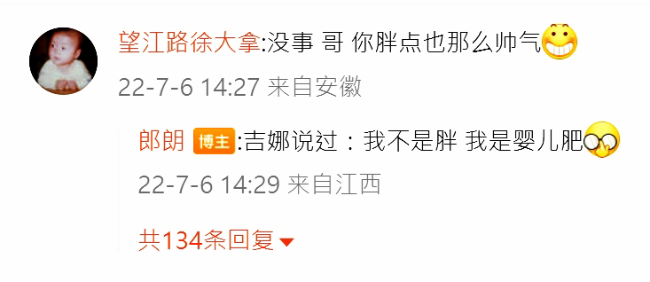 還有網友留言「沒事,哥,你胖點也那麼帥氣」,而郎朗霸氣回應「吉娜說過,我不是胖,我是嬰兒肥」,這回應真的是閃瞎眾人!小編覺得郎朗應該是幸福肥吧!