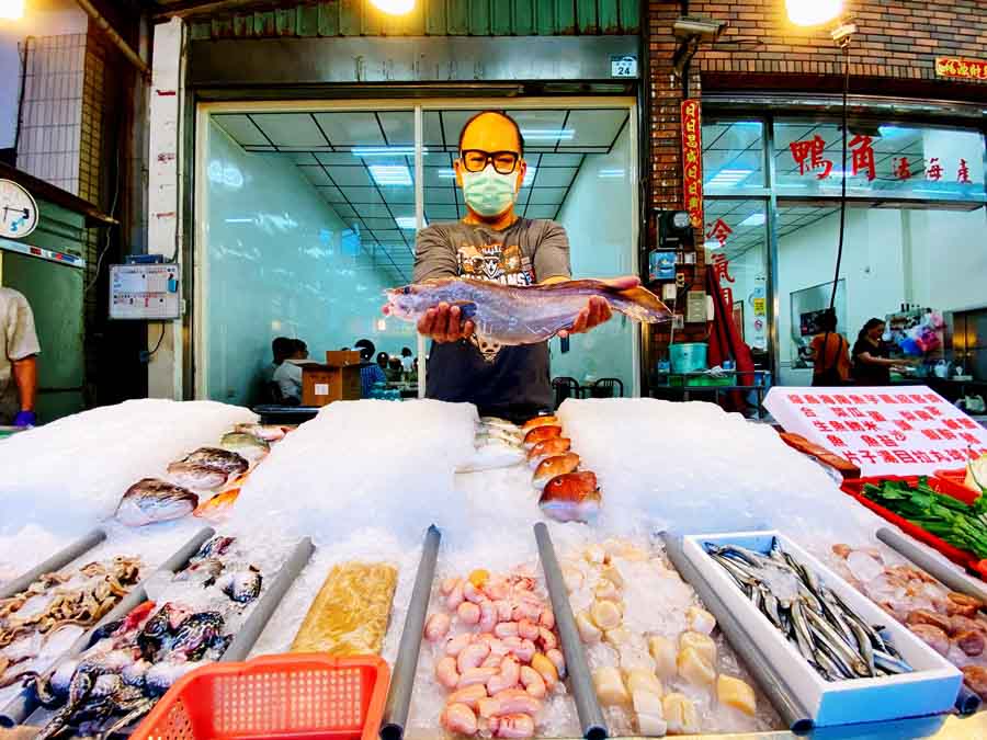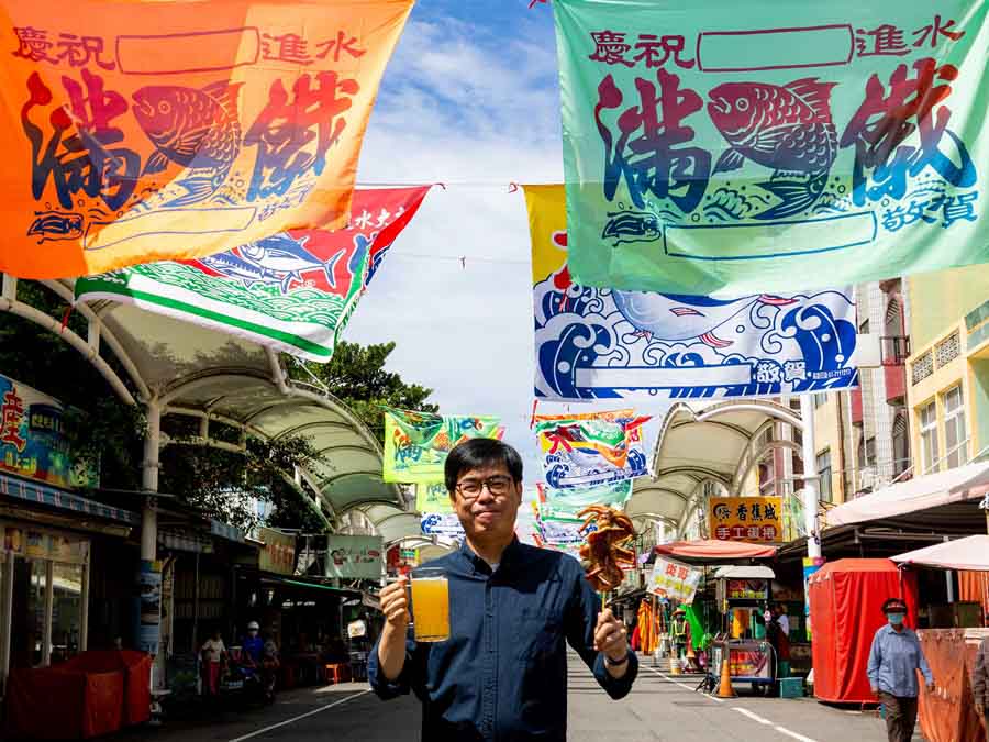 ▲陳其邁市長歡迎大家來旗津遊玩,在漁旗底下拍網帥照。