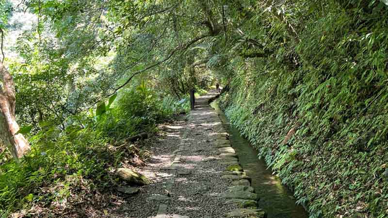 沿著大羅蘭溪左岸步道多是平緩碎石路,兩旁綠樹遮蔭,透過林間空隙望見大羅蘭溪白淙溪影,潺潺流水聲讓人感到清幽涼爽,忘卻炎炎夏日。在行經第一個觀景台,爬上石梯步道後,迎面而來流水淙淙的古圳水道,這條古圳道是日治時期開鑿的水圳,原先目的是教導泰雅族人種植水稻,雖然現在福山部落裡不見水田,水圳依然暢流,更成為了各種生物像是蜻蜓、蝴蝶等溪流環境生物的天堂,也讓民眾能一窺當時的農業發展過程。