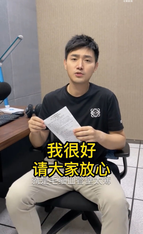 黃新琦表示鼻血幾分鐘就止住了,所以主動要求回主播台繼續直播,後來主管也很關心他的身體,「一再叮囑我要去醫院做一個檢查,然後今天早上我就去醫院掛了個號,確實沒什麼問題。」他表示,主要就是鼻腔壁太薄、天氣熱又上火,他真的沒事,感謝大家的關心。