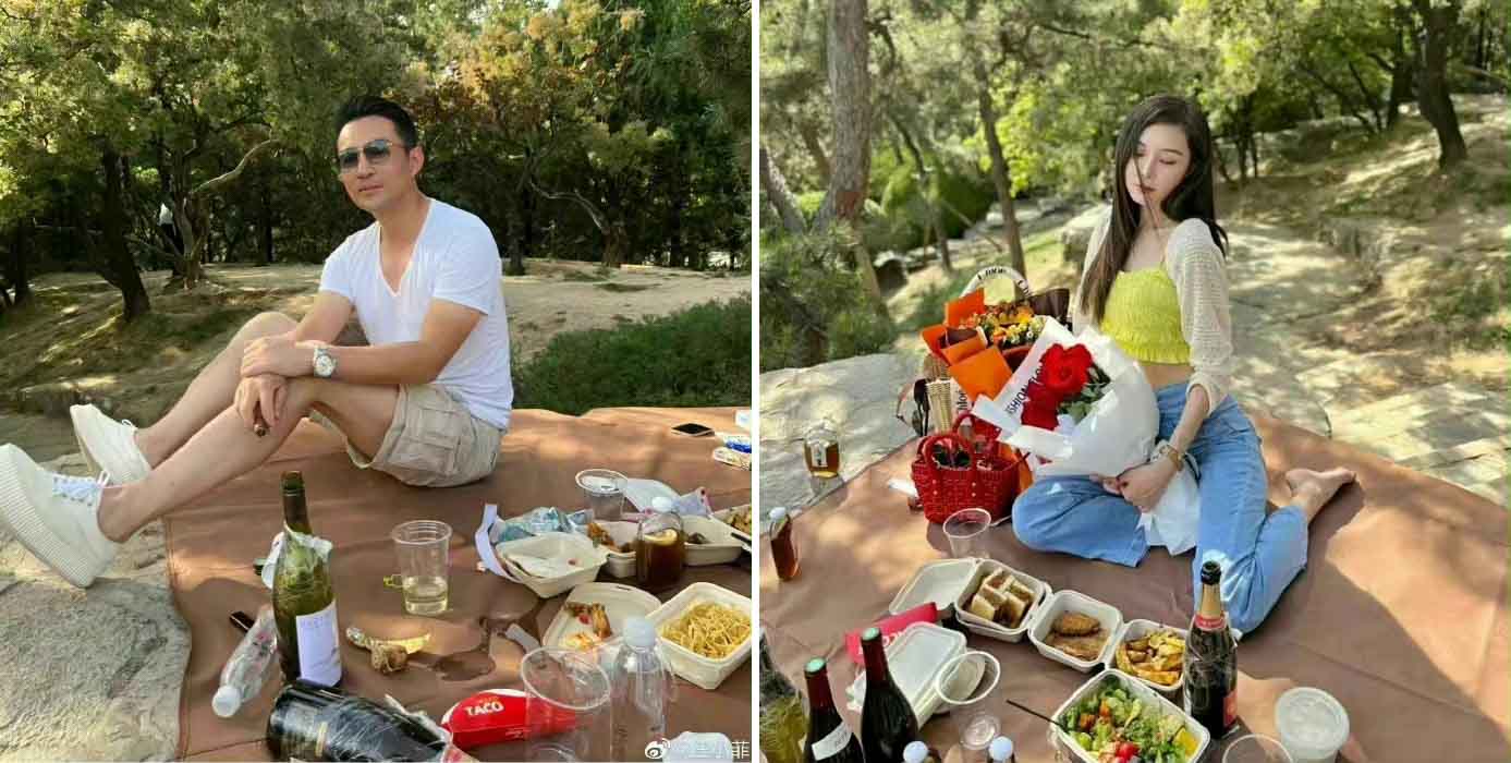 ▲汪小菲和張穎穎一同野餐,張穎穎手捧紅玫瑰、手指戴大鑽戒。(圖/百度)