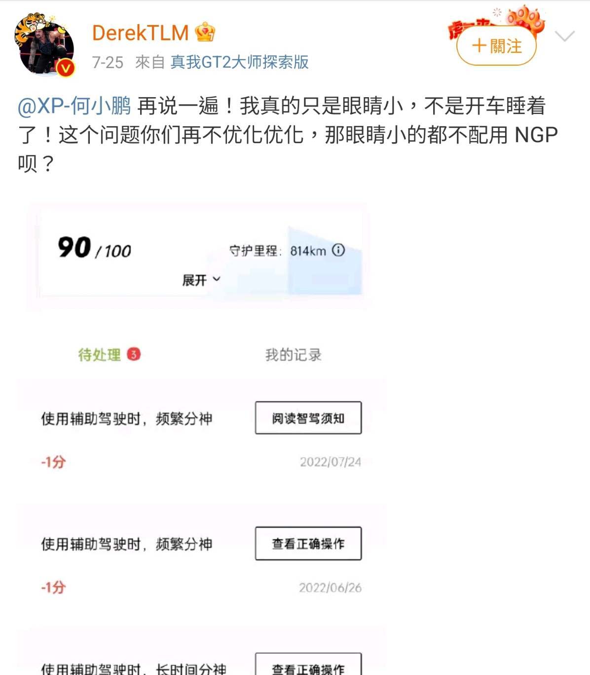 一名部落客Derek前日(25)曬出一張APP截圖,他的「智駕分」已經被扣了10分,系統會提醒他應該要多去學學車子的安全使用內容。Derek發圖配文抱怨「我真的只是眼睛小,不是開車睡著了!這個問題你們再不優化優化,那眼睛小的都不配用NGP(自動導航輔助駕駛系統)唄?」