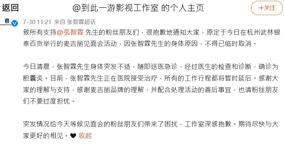 張智霖前日原本要在杭州出席保養品牌的見面會,但卻臨時取消,經紀公司表示,當天一早張智霖就突然身體不適,而且馬上就到醫院急診。「經過醫生的檢查和診段,確診為膽囊炎」。