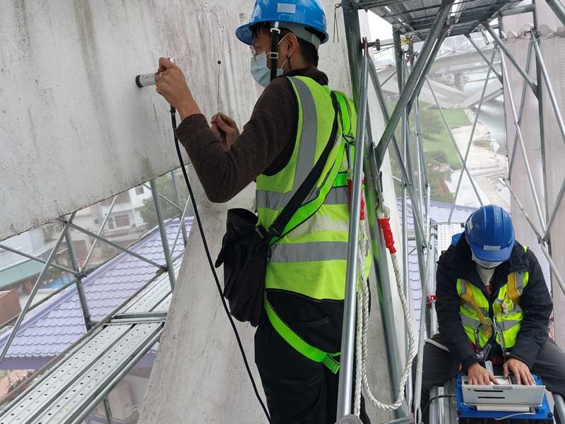 吊橋混凝土橋塔柱部分,過往的結構安全分析集中於檢測裂縫長度與寬度,本次運用最新的敲擊回音法,得以檢測裂縫深度,能更準確判讀混凝土結構強度穩固性。