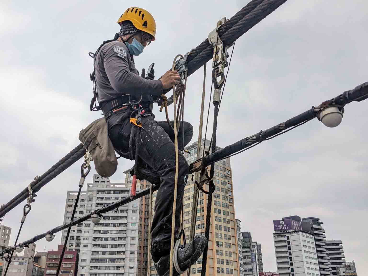 ▲運用高空蜘蛛人作業檢測碧潭吊橋垂吊索穩定性。