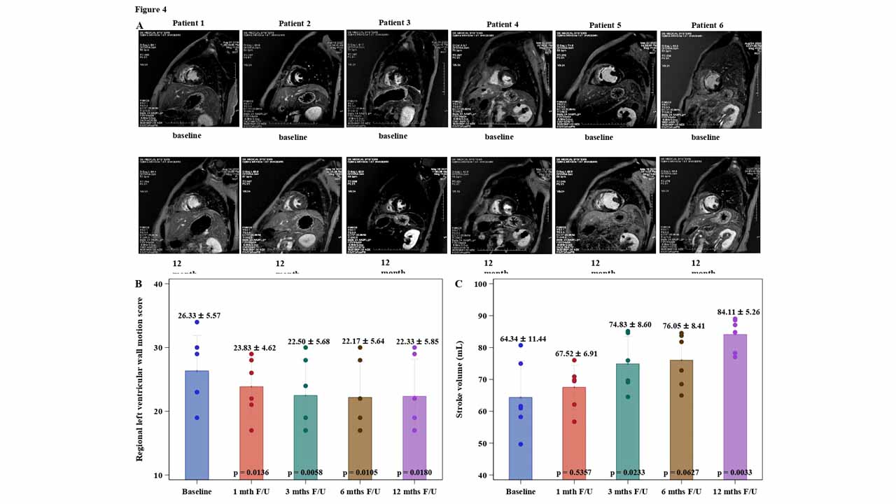 中國醫藥大學附設醫院內科部心臟血管系蕭連城主治醫師,統計臨床研究專案治療後整體病人的心臟衰竭指標NT-proBNP從1362 pg/mL下降到109 pg/mL(NT-pro BNP 參考值 <125 pg/ mL),以及心臟磁振造影測量的左心室射出分率也從52%進步到62%。