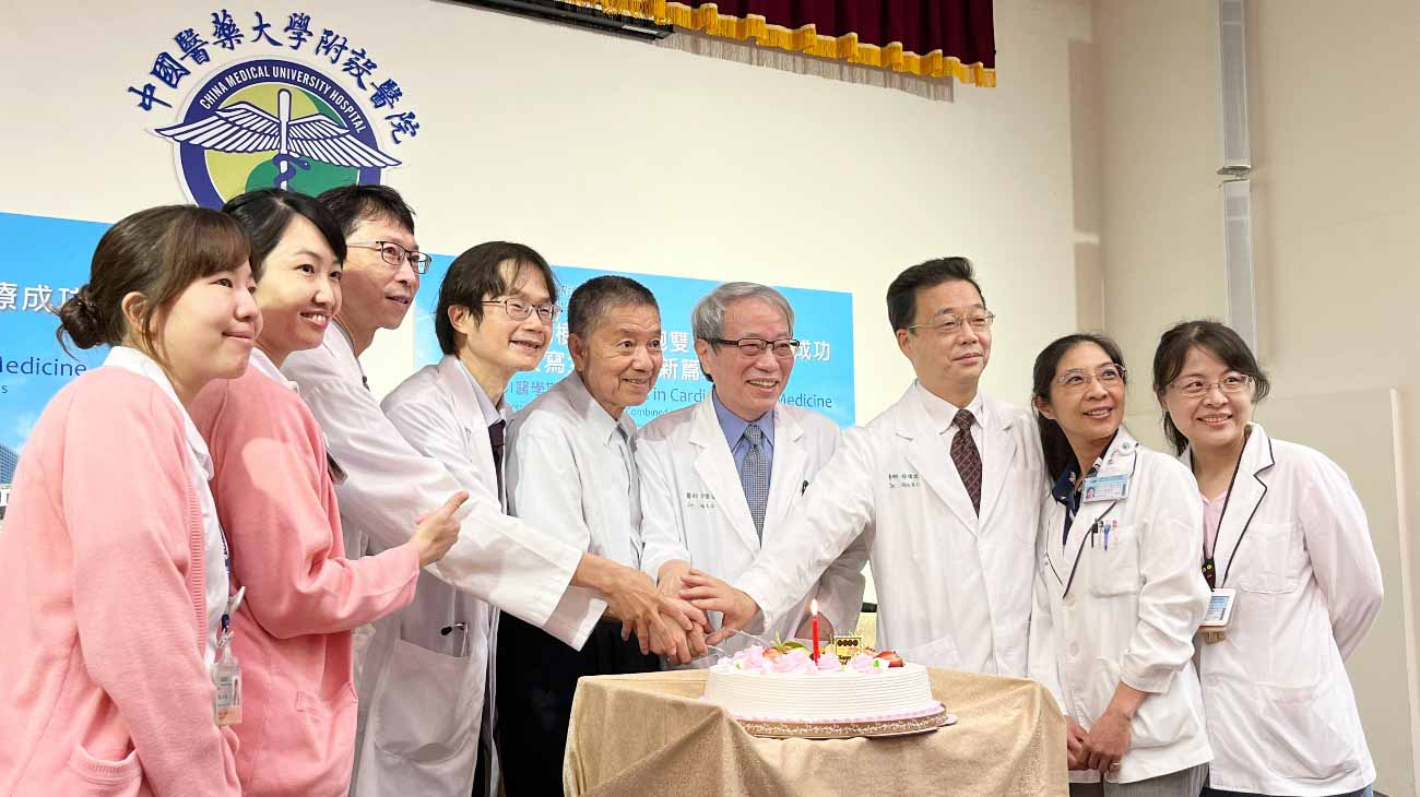 73歲的吳伯伯有高血脂病史,兩年前的一個下午,他感覺胸口沉重如同有大石頭壓著,渾身像四處堵住且非常難受,並直冒冷汗,吳伯伯急忙躺下來驚覺不妙,趁清醒時交代家人務必叫救護車送他到中國醫藥大學附設醫院急診,經研判為急性心肌梗塞,心臟科醫護團隊緊急進行心導管治療,放置心臟支架,接著吳伯伯住進加護病房嚴密觀察;人類心肌細胞恢復能力有限,一旦心臟病發作,受損的心臟往往無法自我修復,還可能朝向繼續壞死,造成嚴重的心臟衰竭,吳伯伯命懸一線,中國醫藥大學附設醫院細胞治療醫護團隊,向吳伯伯家屬建議同步進行幹細胞治療,修補受損嚴重的心臟,並採用冠狀動脈與周邊靜脈雙徑注射異體幹細胞治療,這項全球首創的心臟治療臨床試驗法,成功輔助心臟恢復效能。吳伯伯接受中國附醫創新細胞治療法後,追蹤心臟衰竭指標NT-proBNP,從治療前的2159 mL,一路下降到治療後169 mL(50~75歲急性心衰竭閥值為900 pg/mL),11天後吳伯伯出院,還能小跑步穿越馬路,證明吳伯伯心臟已經成功回到安全狀態,重啟健康人生。