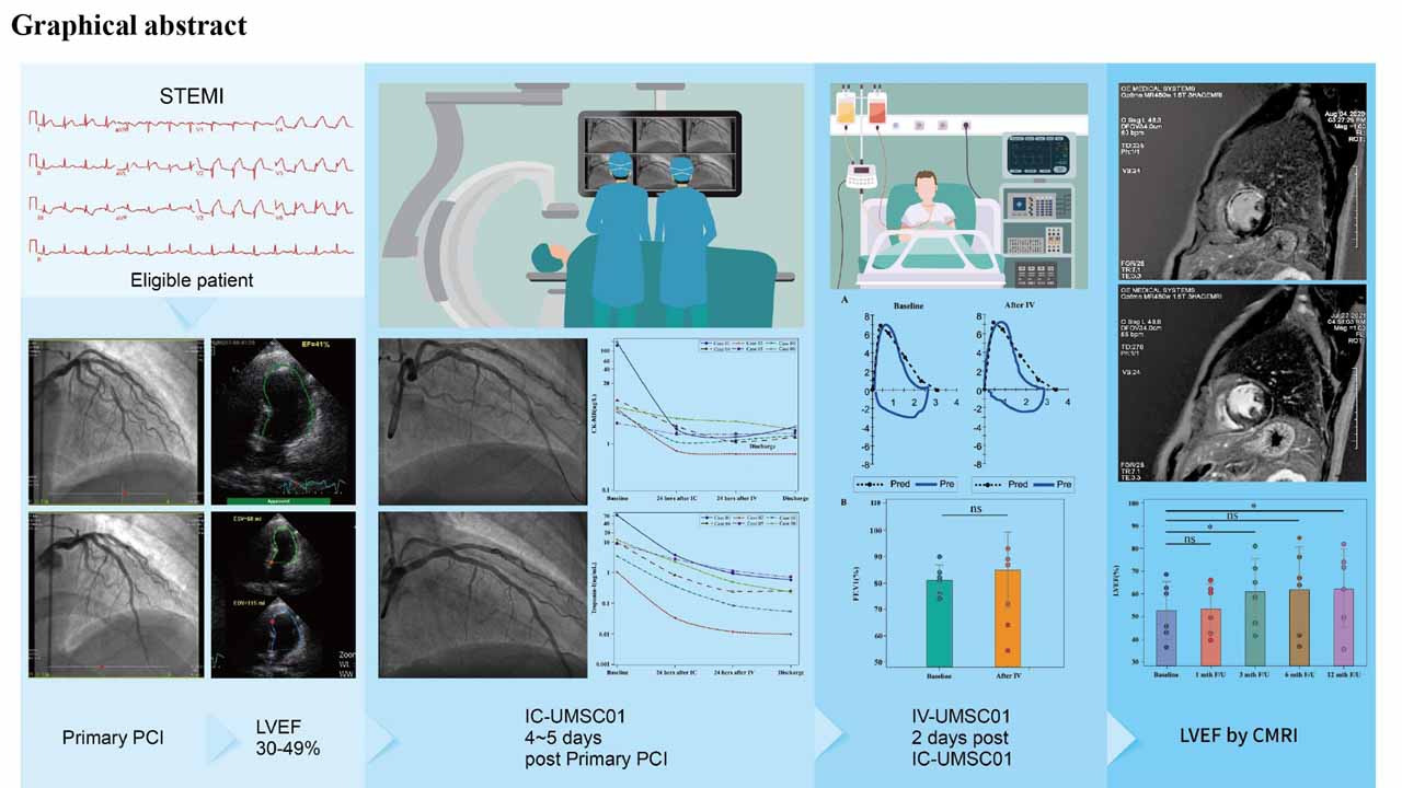 中國醫藥大學附設醫院細胞治療中心鄭隆賓榮譽院長指出,基於臨床上心肌梗塞無法解決的心臟功能不全,中國醫藥大學附設醫院細胞治療團隊先後向美國FDA與台灣TFDA申請通過急性心臟梗塞的細胞治療臨床試驗(clinical trial),並和中國醫藥大學衍生企業長聖生技公司合作,提出全球首次以雙重路徑的創新注射模式,進行幹細胞治療急性心肌梗塞第一期臨床試驗,該計劃於2019年取得美國FDA及台灣TFDA核可,登錄於國際臨床試驗ClinicalTrials.gov網站,針對急性心肌梗塞病人在打通梗塞血管後心臟收縮功能不佳的病人,進行臍帶間質幹細胞治療,並全球首創以冠狀動脈與周邊靜脈雙徑注入異體幹細胞於受損心臟,加速恢復病人心臟效能,術後追蹤一年,評估創新治療的安全性和觀察心臟功能改善的效果。