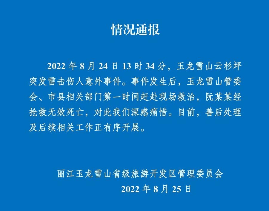 中國雲南省一對新人,選了日子特地到玉龍雪山景區拍婚紗照,但是天公不作美,當天烏雲密佈、細雨綿綿。拍照到一半,新郎竟突遭雷擊,急救中心急忙派人前往查看,確認新郎當場死亡,喜事變喪事。