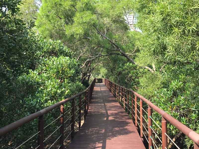 首先推薦的是「淡水紅樹林生態步道」,民眾可搭乘捷運淡水信義線抵達紅樹林站,一出站就能抵達鄰近的生態步道,木棧道平坦好走,不用爬山也能看見一片鬱鬱蔥蔥的療癒美景。接著可以租借Youbike沿「淡水河岸自行車道」騎乘漫遊,或是搭捷運到淡水站,步行至「淡水老街」品嚐阿給、魚酥和鐵蛋等當地特色小吃。