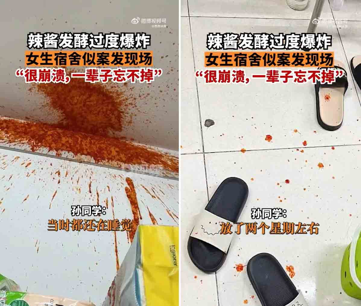 ▲辣椒醬爆炸之後整間宿舍就像命案現場。(圖/微博)