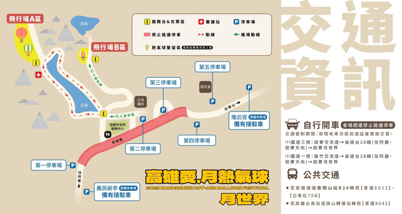 交通方面,此次月世界場域周邊規劃5個活動停車場及隆后宮、義民爺廟2個備用停車場,備用停車場並提供接駁服務。活動會場周邊全線禁止路邊停車,並將視現場車流實施彈性交通管制措施。除了開車之外,民眾也可以到高雄捷運「南崗山站」搭乘8012及紅70B,或到高鐵台南站、旗山轉運站搭乘高雄客運8042公車前往。無論是已線上購票預約或欲至現場購票搭乘的民眾,均請提早出門,以免錯過難得的熱氣球繫留體驗,建議出門前關注熱氣球最新消息,請上觀光局官方網站高雄旅遊網、FB官方粉專、IG及「2022高雄愛.月熱氣球」臉書,以隨時掌握活動現場最新資訊。