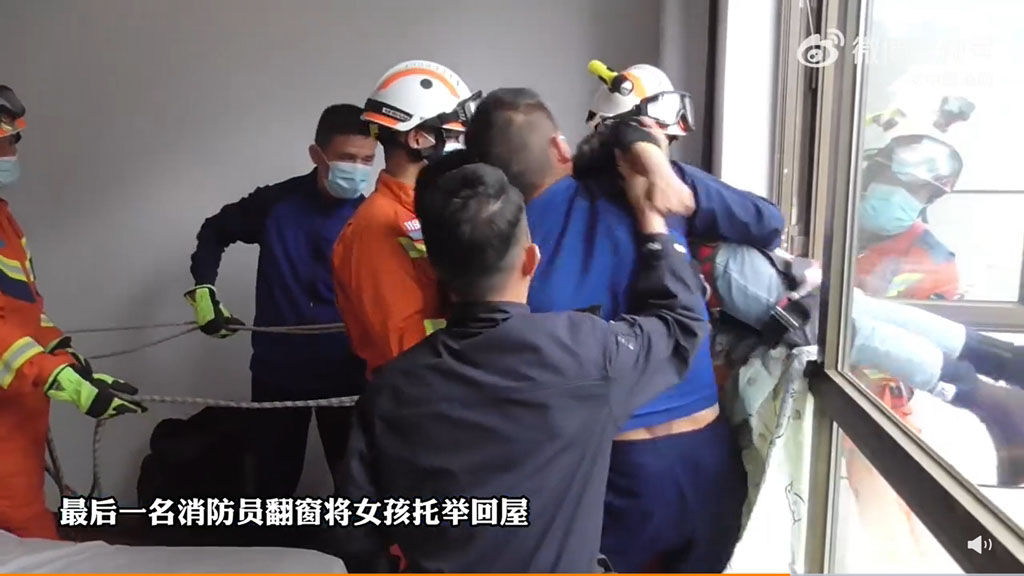 小女孩腳都麻了,嚇得連站都站不起來;最後消防員破壞窗戶、翻出窗外,先在小女孩的身上綁好安全繩才將她托入房內,總算是救下一條年輕小生命。