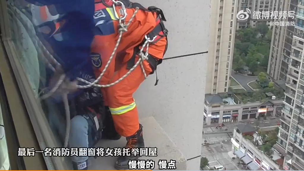▲消防員翻出窗外救人。(圖/微博)