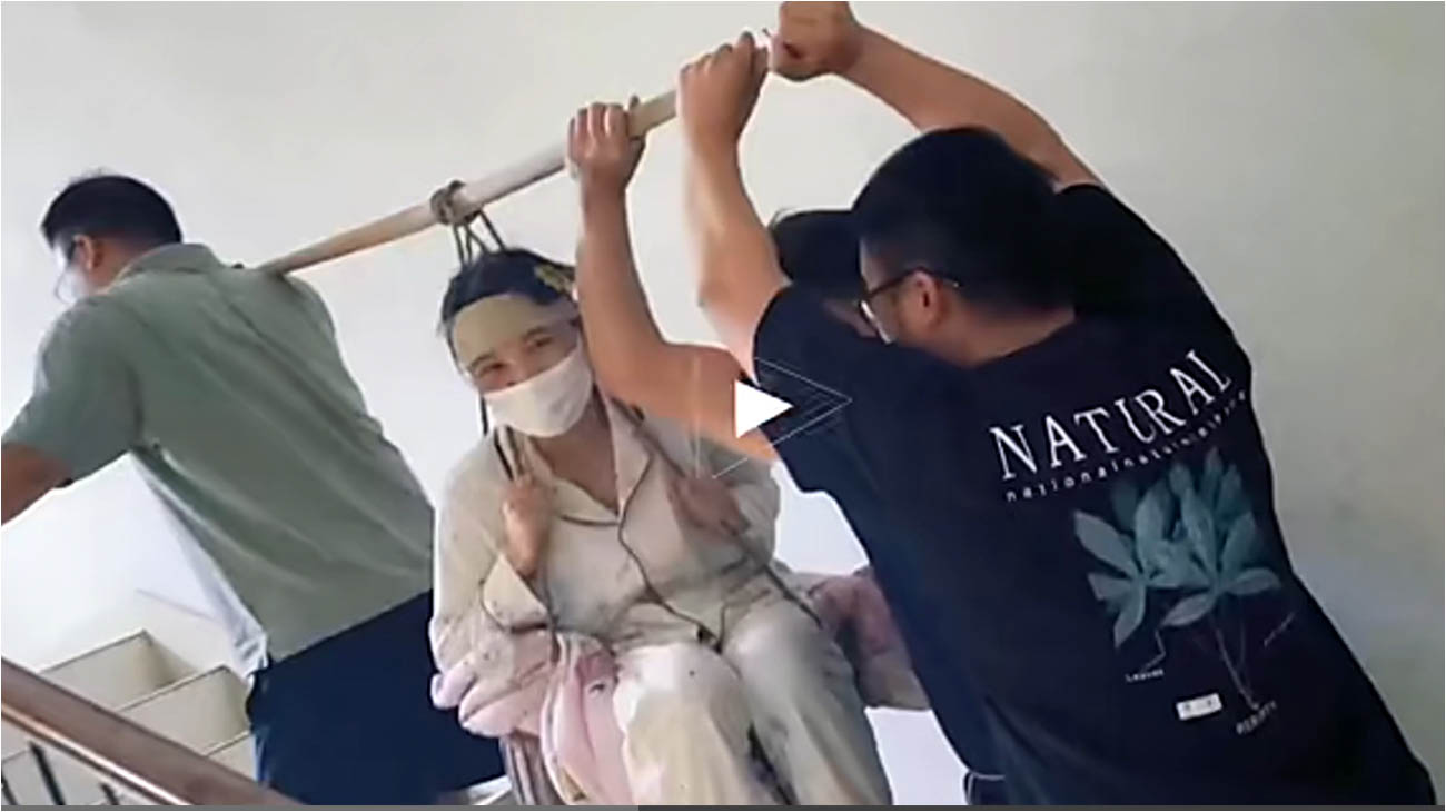 李女說:「因為剖腹產傷口是很疼的,然後就想了這樣的一個辦法。」、「他們抬得很辛苦,但是我很舒服。」李女在被三位壯漢小心翼翼搬運的過程中,還伸出手指對鏡頭比YA。