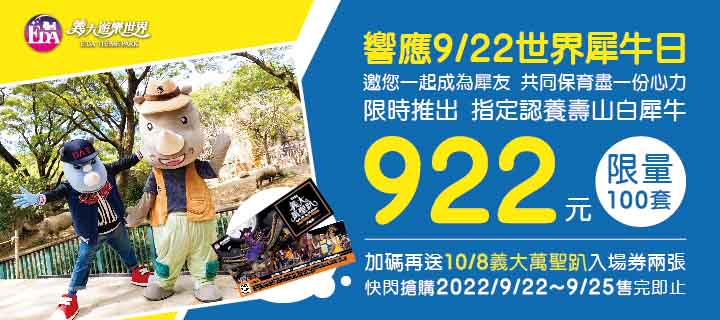 壽山動物園特別感謝義大遊樂世界響應世界犀牛日,自9/22至9/25只要捐款922元並指定認養白犀牛,即可拿到壽山動物園動物認養卡(價值500元)及黑熊聯名款潮帽(定價550元),憑動物認養卡還享有壽山動物園112年底前不限次數免費入園優惠,希望讓犀奇、寶寶和其他動物朋友們受到更優質的照顧,有關期間限定的動物認養資訊可至義大遊樂世界官網查詢。