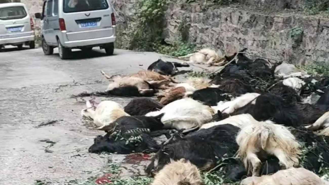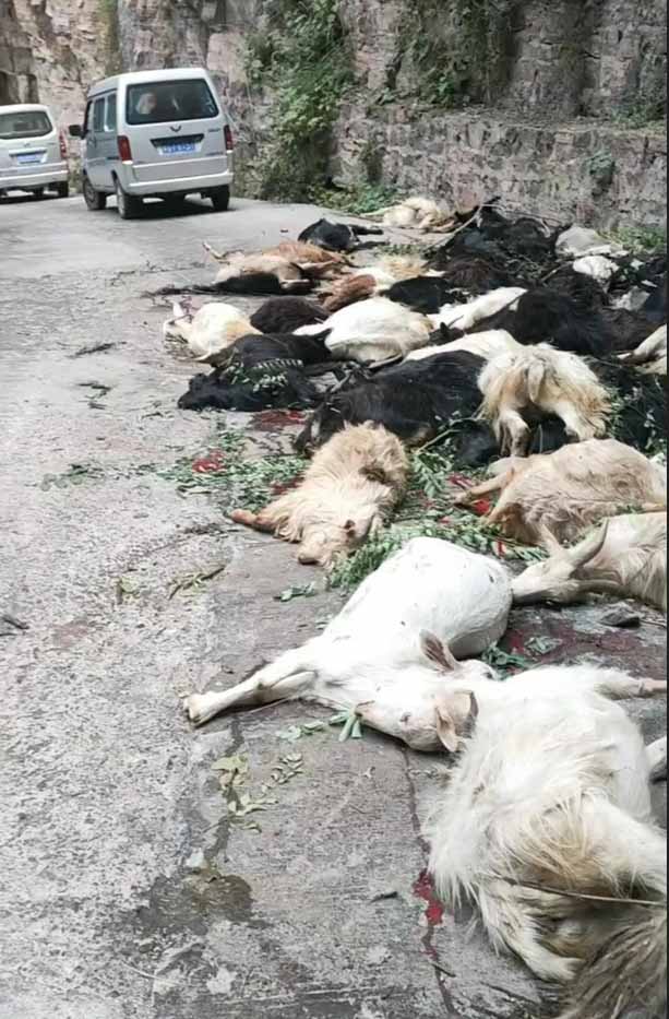中國河南省前日(24)發生一起駭人事件,有90多隻山羊集體跳下60多公尺高的山崖,結果當然是無一倖免、全部死光光。飼主可說是血本無歸,只得將還緊急賤賣這些羊屍來換取現金。