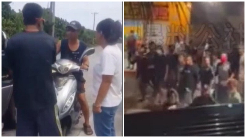 ▲圖左為被遊客挑釁的夫婦,正在將過程告知騎機車的村民。圖右為晚間大亂鬥。(圖/爆料公社)