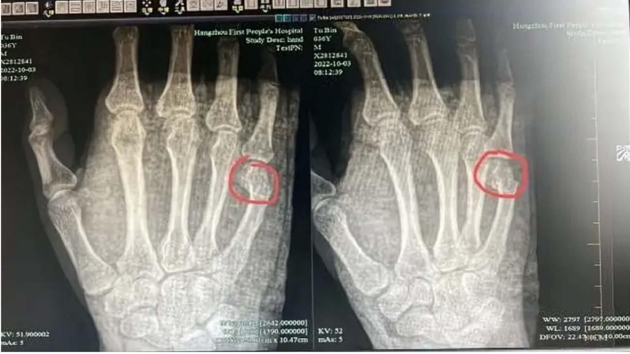 最後吳爸爸忍不住吼了兒子幾聲,沒想到兒子也是個拗脾氣,竟直接把筆給放在桌子上,也不解題了!吳爸爸忍無可忍,直接一拳砸在了書桌上!沒想到這一拳揮出之後手掌劇痛,原來是他的手掌第五指指股遠端骨折,斷處明顯位移,甚至還需要住院治療。