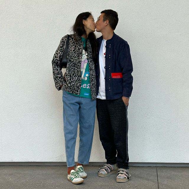 照片中陳冠希身穿白色T-Shirt,搭配深色外套,下身穿一件黑色長褲,腳上穿著襪子搭配涼鞋,如果換一顆頭,可就沒這樣的時尚了。他的妻子秦舒培則是穿了一件綠色印花T-Shirt及豹紋外套,兩人手都插在口袋裡,只有一個簡簡單單的親吻動作。