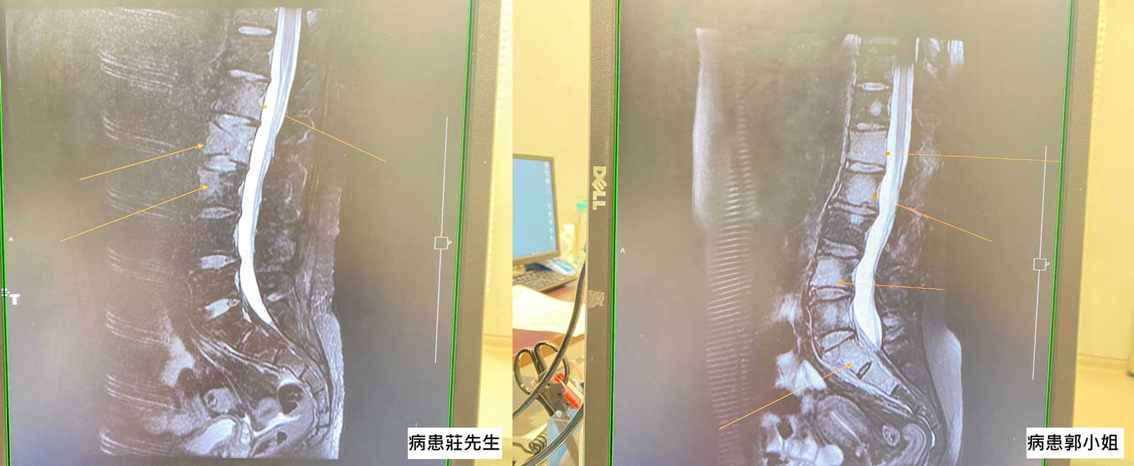 另外一個病患為56歲郭小姐,平常身體狀況不錯,也是突然間腰很痛,吃藥、復健都沒好,就診前兩天右側髖關節那邊,甚至痛到沒辦法走路,原先以為只是椎間盤問題,安排核磁共振意外發現脊椎有多顆轉移性腫瘤,經過抽血、電腦斷層、AIRO導航系統取樣等一系列檢查,判斷是肺癌合併多重的脊椎骨折。