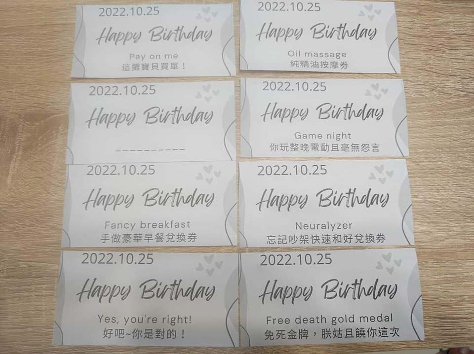 只見每張兌換券上都寫著「2022.10.25 Happy Birthday」以及不同的「票面字樣」,有「Pay on me,這攤我買單!」、「Oil massage純精油按摩券」、「Game night你玩整晚電定且毫無怨言」、「Fancy breackfast手做豪華早餐兌換券」,看來真的是用心製作。