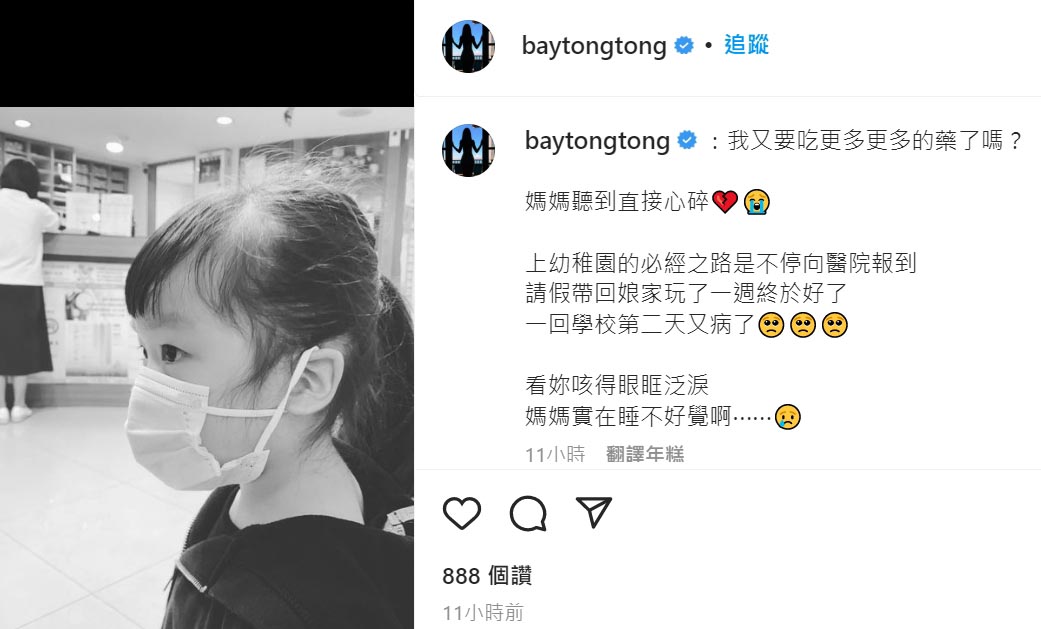 貝童彤今日凌晨在IG發文,表示女兒上幼稚園之後,「必經之路是不停向醫院報到」,好不容易請假一週,帶女兒回娘家玩,終於病好了,但是回到學校上學第2天馬上又生病了。