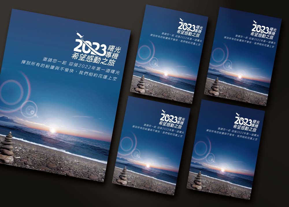 繼2022年花蓮曙光專機成功跨越雲層,欣賞新年第一道曙光,2023年元旦花蓮縣政府再次攜手花蓮旅行業者推出台北飛花蓮曙光專機,搭配兩天一夜的「希望旅程」,帶遊客飛上天際,在清水斷崖上空迎接曙光,期盼新的一年運勢也能一飛沖天,元旦當天還有曙光船,在海豚的陪伴下開啟嶄新的一年。
