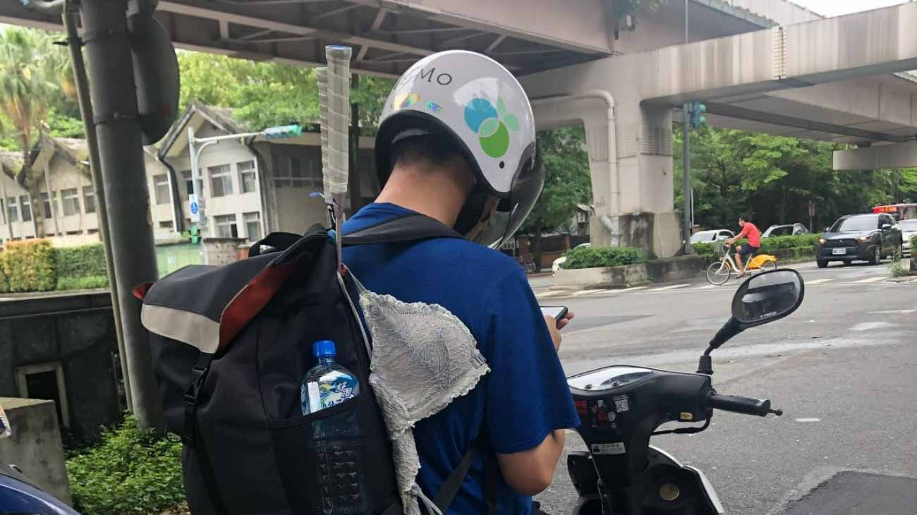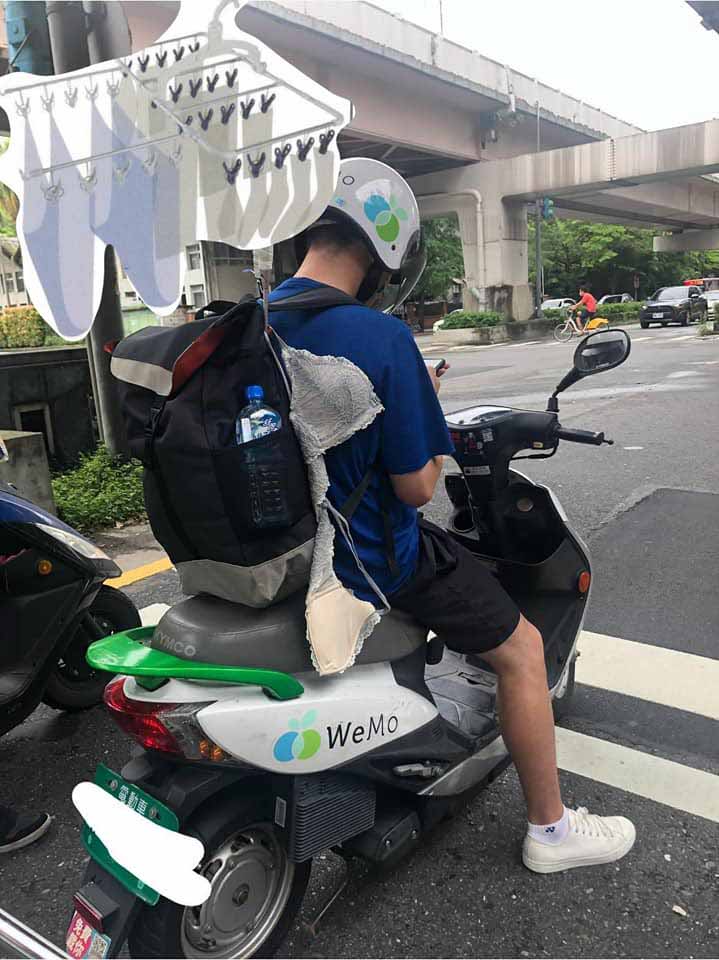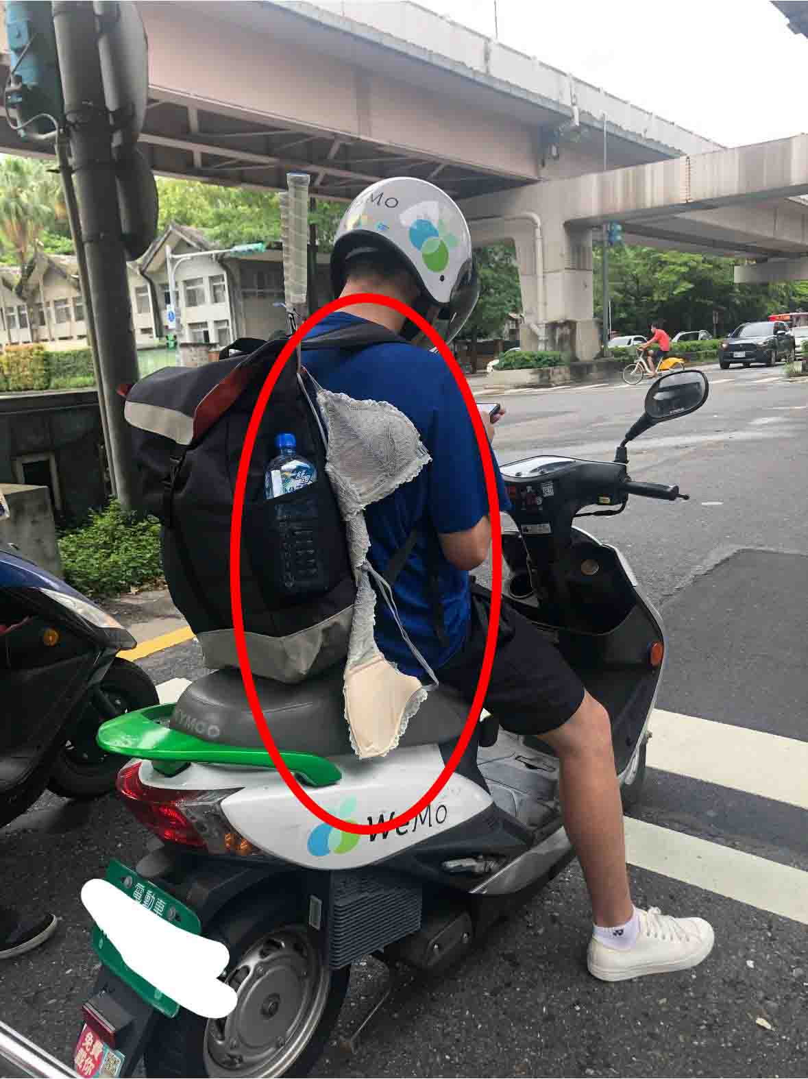 一名網友騎車上路,看到前方騎著共享機車的男騎士,背上竟然掛著一件女性性感內衣,忍不住跟在他後方騎下去,心裡還一直猜到底是怎麼掛的。網友看後笑翻,也紛紛開始幫忙推理。