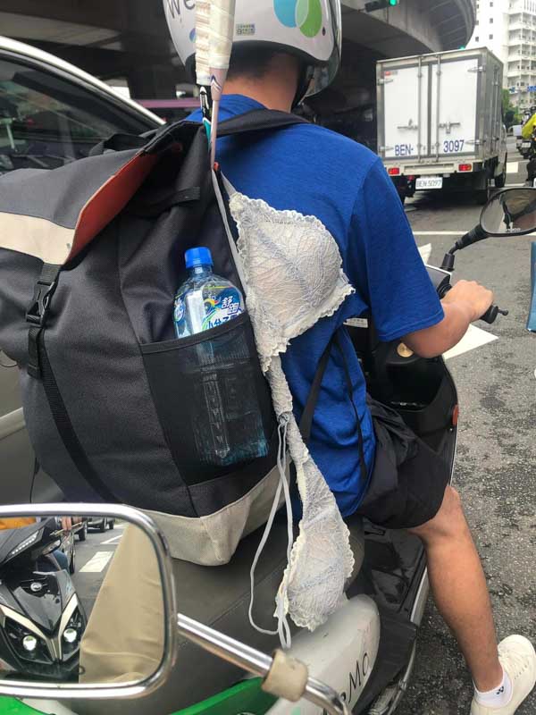 原PO在臉書社團「路上觀察學院」貼了兩張停等紅燈時用手機拍下的照片,她寫道「我就跟著他的奶罩騎了幾個路口,一路上想著怎麼掛上去的」。只見前方男騎士的背包除了兩隻羽球拍,上頭還真的掛了一件女性內衣,看起來似乎還是前扣式的,款式相當新潮。