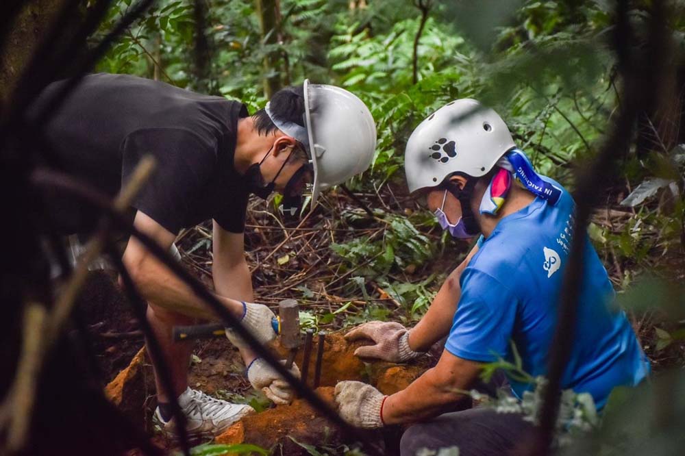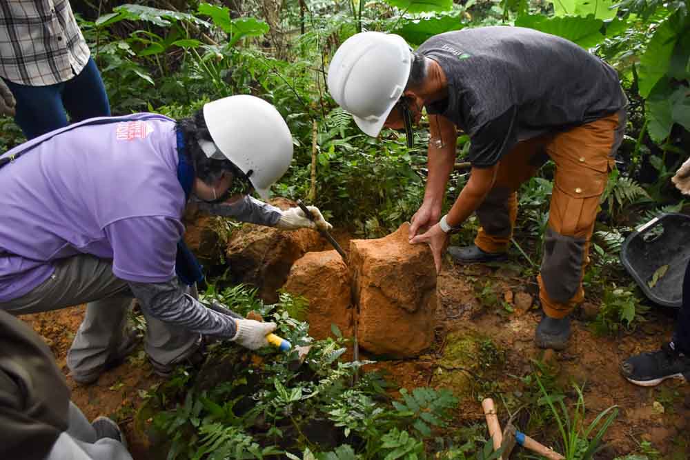 ▲志工利用工具劈開大石頭作為步道石階。