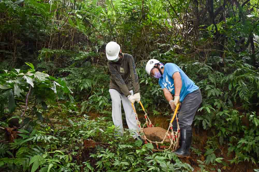▲志工就地取材採集泥土和大石頭。
