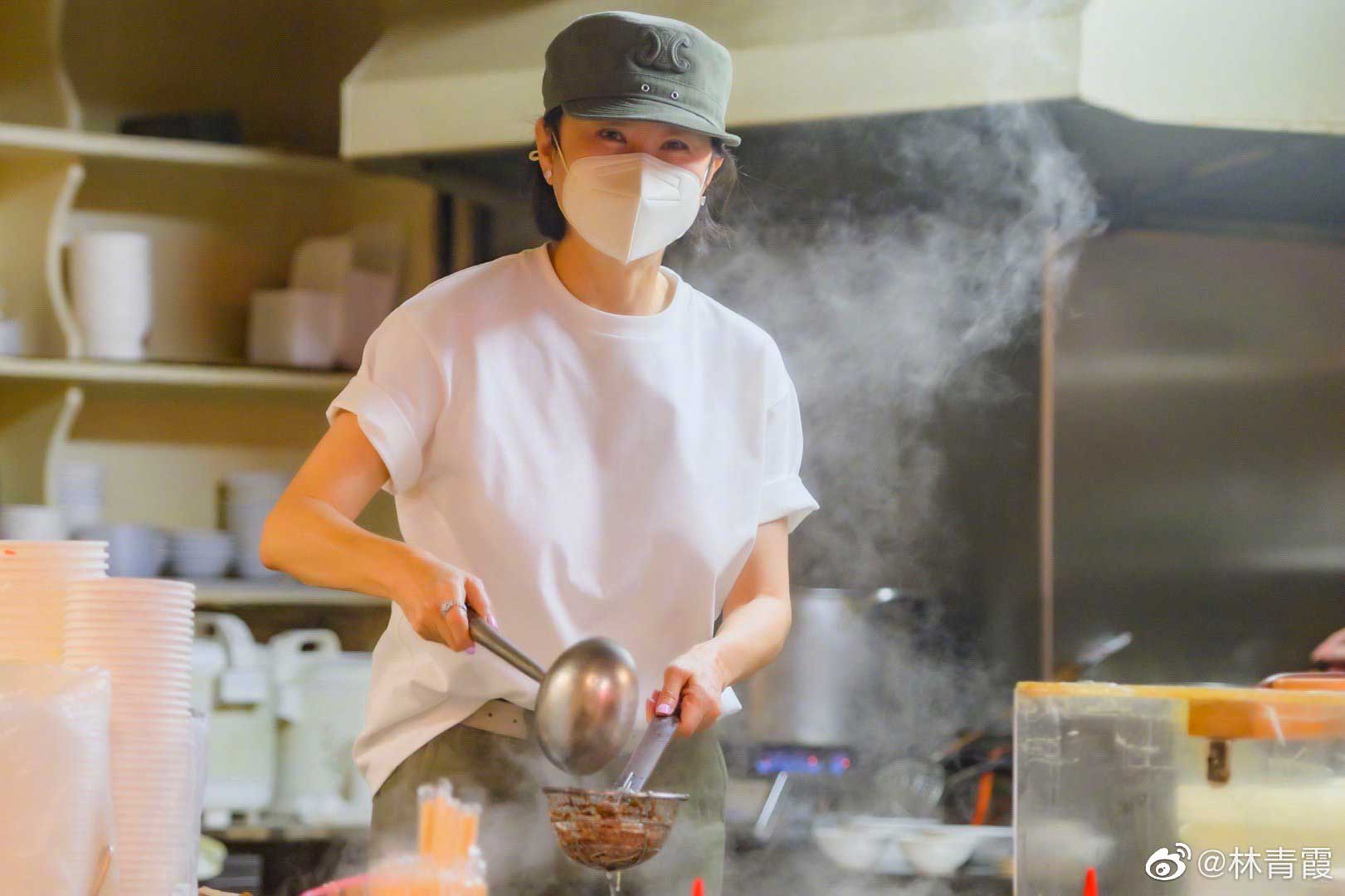 林青霞昨日一早PO出在台北市民生社區一間麵店拍攝的照片,照片中的她頭戴灰色帽子和白色口罩,身穿白色T-Shirt,打扮得簡約又休閒。至於九張照片每一張她都是在煮麵,讓人看了對女神的平民作為大感訝異。