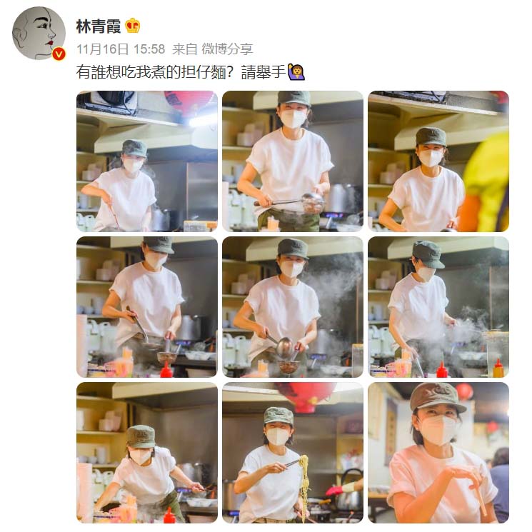 林青霞發文道「有誰想吃我煮的担仔麵?請舉手」,讓許多粉絲紛紛留言回應「我我我我」、「姐姐都会發九宫格了,太棒了姐姐」、「來半斤,先嘗個味道」、「下次也要發這麼多圖哦」、「姐姐妳怎麼突然就下凡了」。
