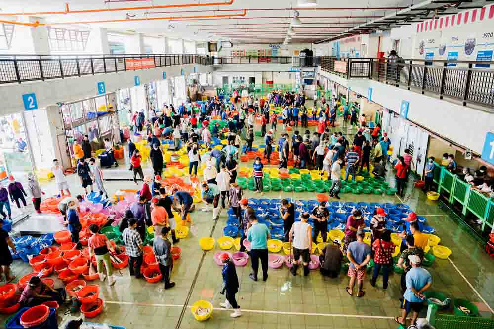 ▲來梓官蚵子寮漁市可參觀糶手漁獲拍賣,參觀製冰過程。