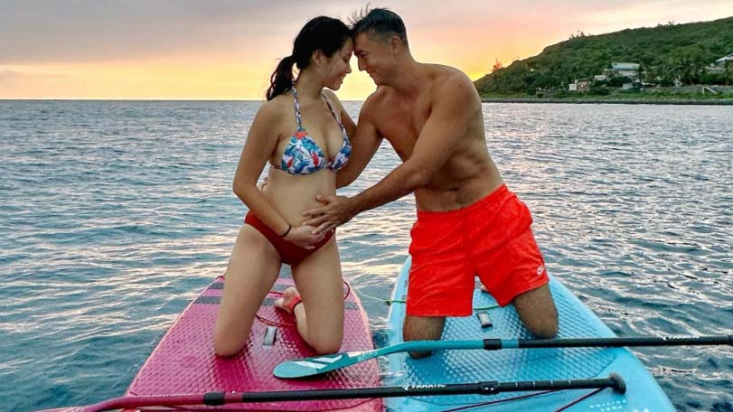 班傑今日(9)上午在小琉球打卡,只見他PO出燦爛笑容照片,其中一張還溫柔的撫摸著愛妻的肚子,寫道「時間到了,準備人生下一個階段。It’s about time to start the next phase in our lives. 」。