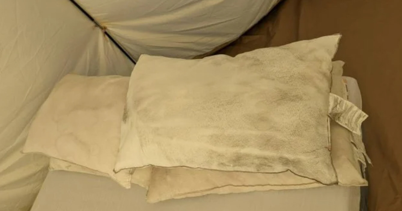 原PO批評現場簡陋、設施破舊,就連帳篷都整個發霉,他還PO出帳篷發霉的近照,小編是看了就反胃,不知道這種地方怎麼能住人。接下來更扯的事情發生了,翻開被褥一看,就連枕頭也是滿的霉菌,實在只有噁爆可以形容。原PO寫道「這還沒完,他們連飲水機的桶裝水都還是直接裝水龍頭裡面的水給客人喝,連過濾都沒有」。