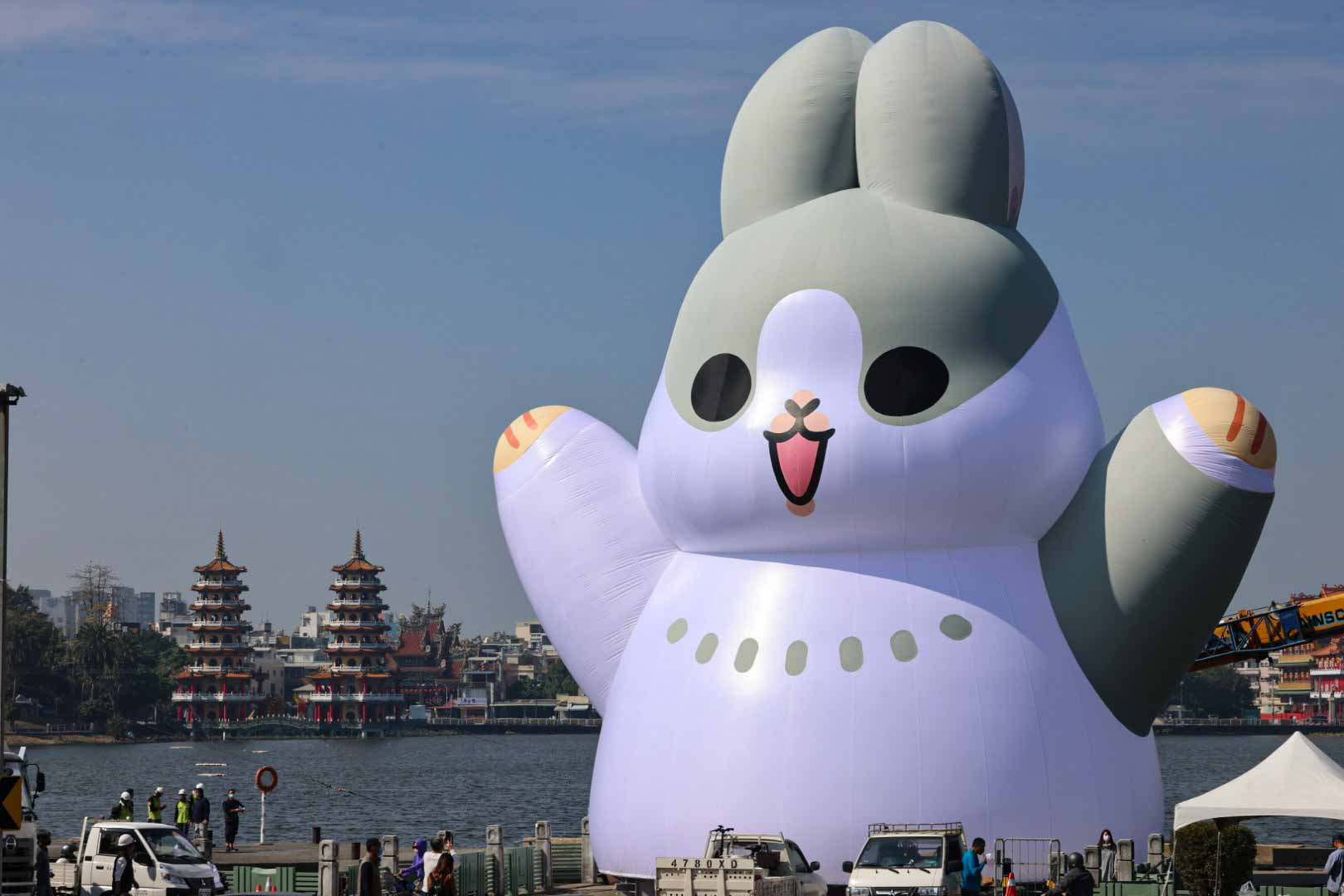 今年移師蓮池潭舉辦的高雄蓮潭燈會進入最後倒數準備,今(19)日高雄物產館後方水域驚喜出現人氣貼圖「ㄇㄚˊ幾兔」巨型可愛充氣裝置,18公尺高的ㄇㄚˊ幾兔,雙手高舉歡迎來高雄賞燈的遊客,將是本次燈會最「萌」賣點。