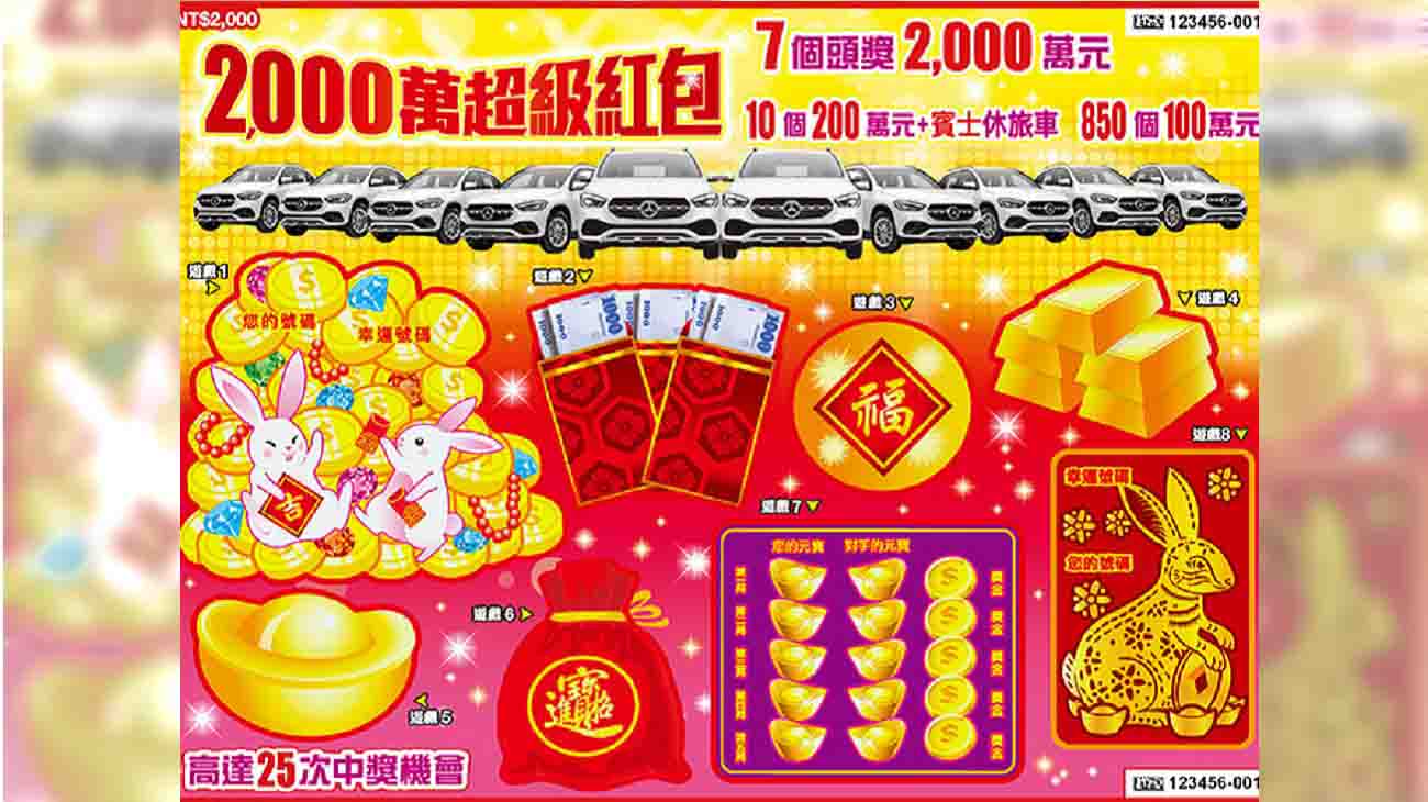 台彩公司表示,這間刮出100萬大獎的彩券行是彰化市「來億發投注站」,目前新春限定2000萬超級紅包,共有7個頭獎2000萬元、10個200萬元加賓士休旅車、850個100萬元,頭獎至三獎數量皆創下史上最多。截至1月20日,已刮出0個2,000萬元、1個200萬元+賓士休旅車、109個100萬元。
