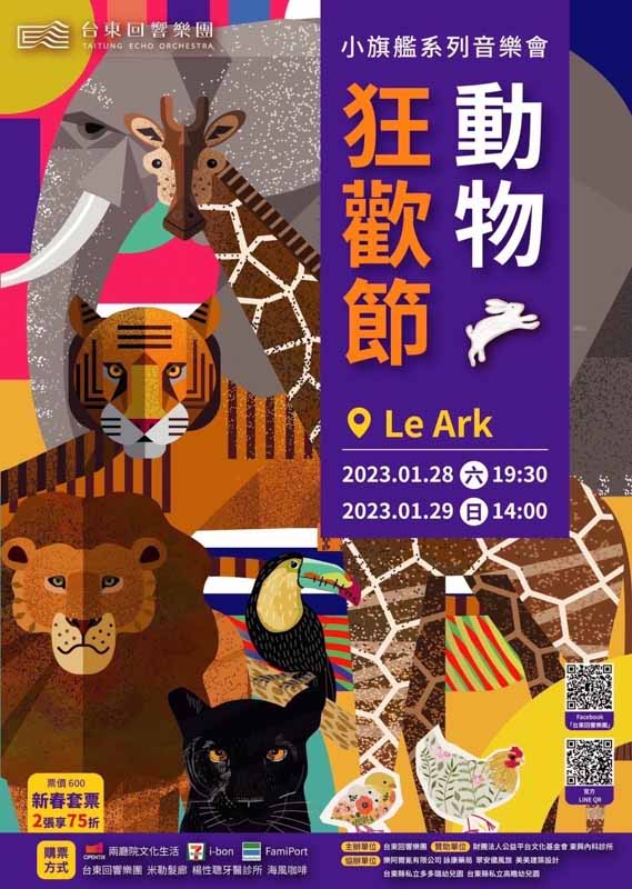 台東縣政府文化處表示,台東縣傑出演藝團隊第一級的台東回響樂團將在春節期間1月28日晚上7:30分、及1月29日下午2:00,於東糖園區Le Ark藝術展演中心(台東市中興路二段191號),辦理精彩的《動物狂歡節》親子音樂會,此次樂團採用沉浸式多媒體全場域技術,除了有特殊的投影在音樂會中,同時還可以搭配餐點,更能充分陶醉在動物狂歡節氛圍中!